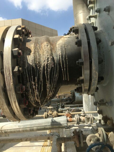 偏心和同心橡膠接頭皆為三元乙丙橡膠生產(chǎn),耐壓20公斤,316L不銹鋼法蘭,用戶(hù)使用的環(huán)境為化工行業(yè),水樣催化劑的介質(zhì),常理來(lái)說(shuō),這類(lèi)介質(zhì),對(duì)橡膠球體本身并不會(huì)造成什么影響,為什么橡膠接頭會(huì)開(kāi)裂呢?通過(guò)圖片情況我們可以看到,橡膠球體外部膠層開(kāi)裂內(nèi)部并無(wú)泄露現(xiàn)象,這種情況一般是由于壓力過(guò)大導(dǎo)致的,但用戶(hù)水泵打開(kāi)壓力又并未超出橡膠接頭承受壓力范圍,所以這一情況進(jìn)行排除,第二種原因就是由于生產(chǎn)問(wèn)題,內(nèi)外膠層貼合不嚴(yán)密的情況下,由于溫度影響造成內(nèi)外膠層分離,進(jìn)而橡膠接頭承壓能力減弱,在運(yùn)行過(guò)程中容易造成開(kāi)裂。