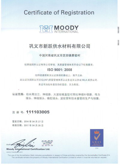 歡迎來到鞏義市新躍供水材料有限公司官方網(wǎng)站!您現(xiàn)在訪問的是:《ISO9001中文認(rèn)證》頁面,如需幫助請(qǐng)致電:13140066578 或 0371-64100988